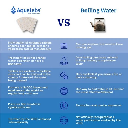 South Africa’s dams, lakes and streams are alive with micro-organisms that threaten human health. These organisms can cause gastrointestinal disorders and diarrhea, specifically affecting children and the elderly who are the most at risk. These water purification tablets are lightweight, portable and indispensable when you’re out exploring the outdoors. The Aquatabs 8.5mg tablets are the perfect solution for disinfecting water from any source. So long as you have access to a freshwater source, there is no need to carry around bulky filters or large volumes of water. With the Aquatabs 8.5mg tablets, you can rest assured that you will be prepared. Whether you are planning a hike, camping trip, or looking for easy, efficient ways to clean your water during a home emergency, use these powerful tablets to keep you and your loved ones safe.