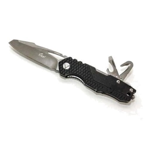 It features a folding Seat Belt Cutter, Small Flat Screwdriver, a Sheep Foot style blade, Window Breaker and Bottle Opener.