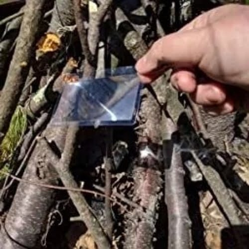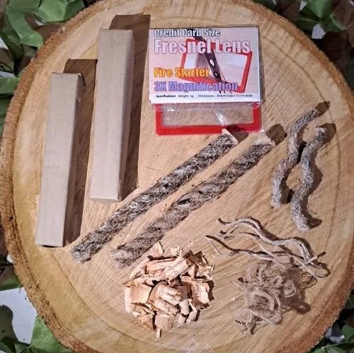 The Fire Making Combo Kit includes Wax Wood, Tinder Rope and a Fresnel Magnifying Lens.