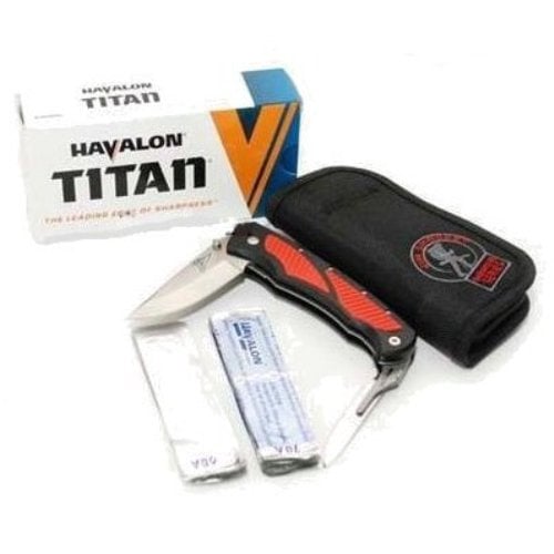 The Havalon Titan features Havalon’s revolutionary Quick-Change blade system on one side and a Cryo hardened AUS8 blade on the other. This combination gives you the unmatched sharpness of a Havalon blade and the strength of a traditional fixed blade all in one tool. This knife is part of the Jim Shockey Signature series made by Havalon.