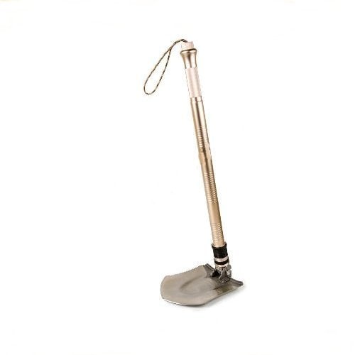 The head of the shovel folds into three locking positions, so can be used as a hoe or for chopping