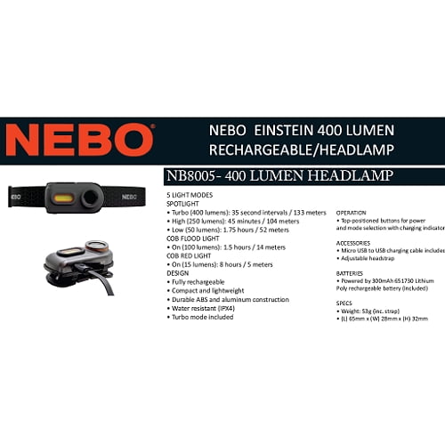 The Nebo Einstein 400Lm Headlaight is a versatile, quality headlamp and boasts 3 light modes: