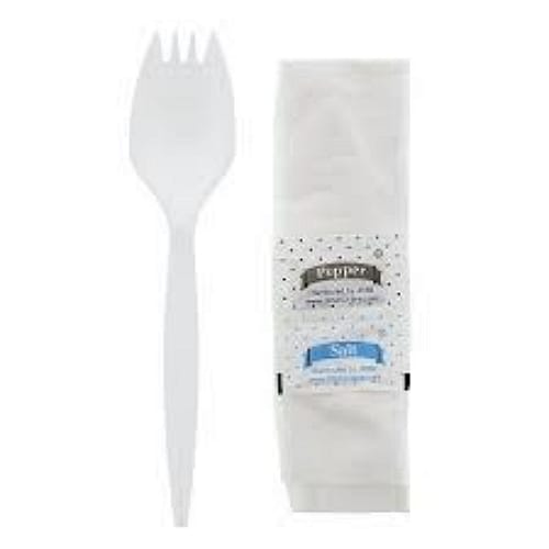 This handy little pack contains a spork, a serviette and a sachet of salt.