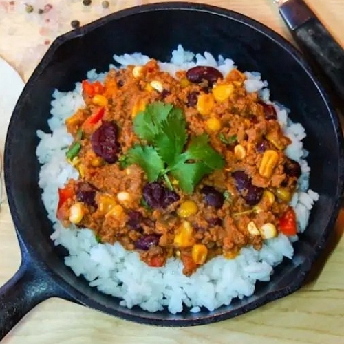 Ingredients: Beef Mince, Onions, Red Kidney Beans, Tomato, Corn, Green Peppers, Rice, Salt