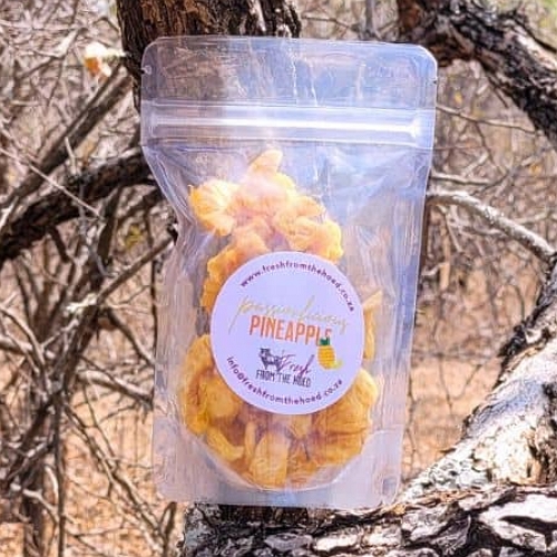 Experience adventure, nutrition, and the taste of the tropics with a 100g bag of Fresh From the Hoed’s Passionlicious Dried Pineapple bites.
